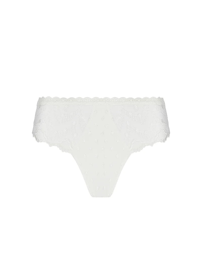 This brief couples soft stretch lace with finely sheer tulle, offering a gentle hold and smooth finish beneath clothing. The scalloped edges lie flat to reduce lines, and the Écru Nacré shade flatters a broad palette of skin tones. Ideal as part of your bridal or romantic lingerie collection when you want elegance and comfort in equal measure.