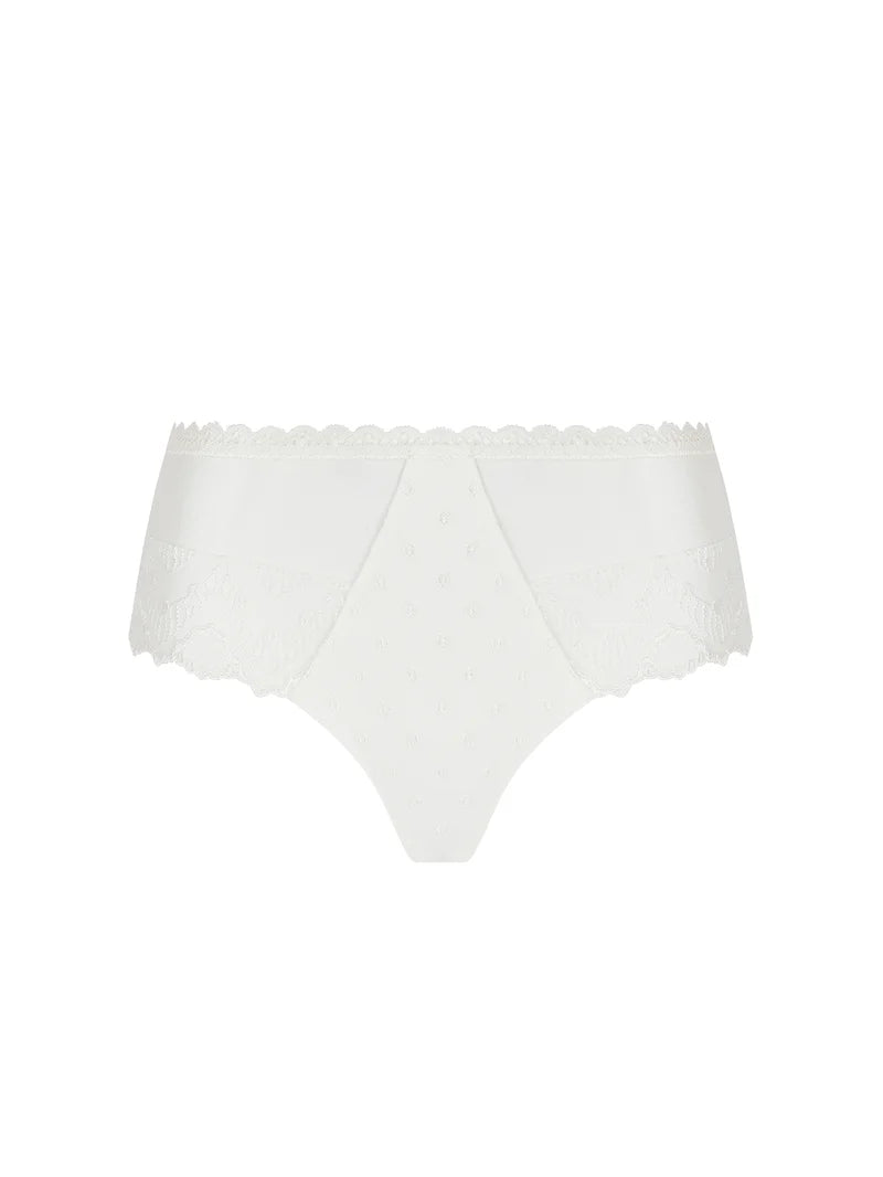 The Je T’aime À La Folie shorty provides mid-level coverage in delicate stretch lace. The scalloped edges flatter the hips while maintaining a smooth line beneath clothing. The Écru Nacré tone captures soft light, making it ideal for bridal wear or as an everyday indulgence that feels like a second skin.