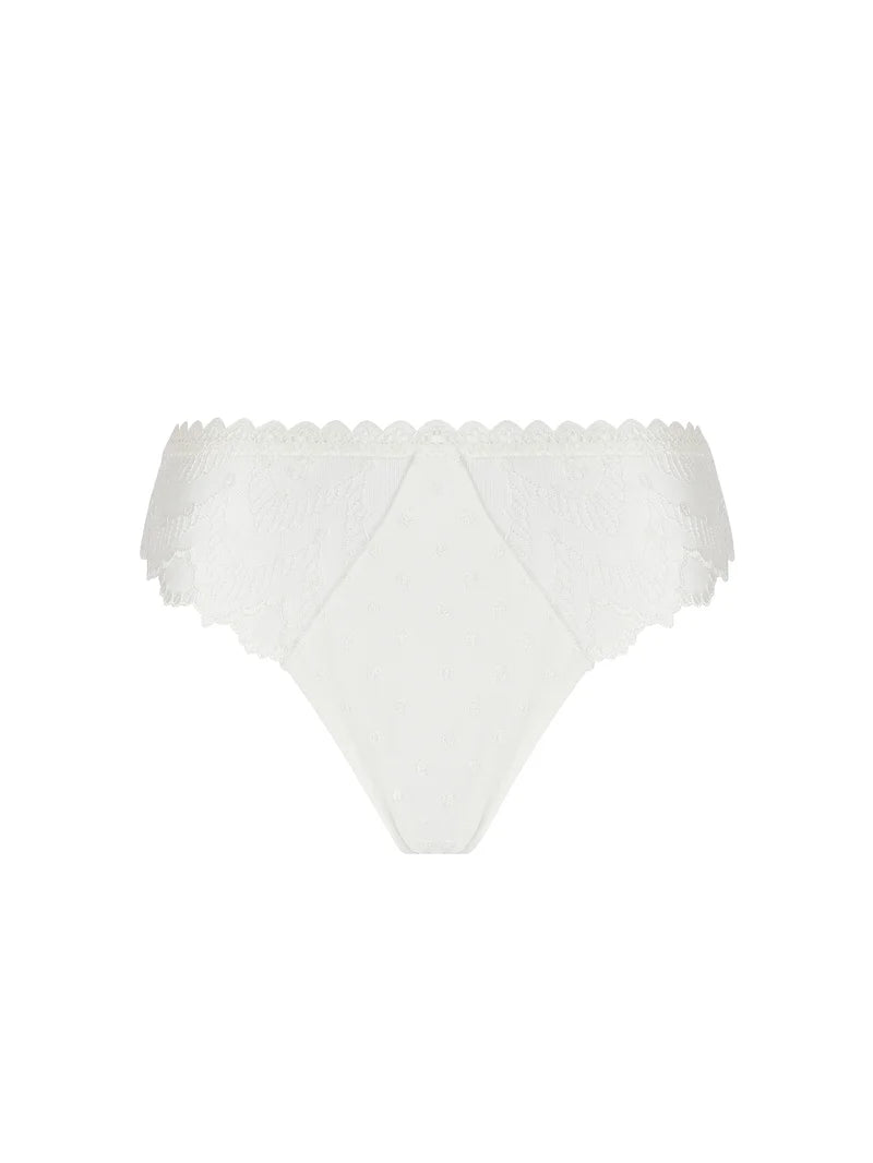 Engineered for invisibility under tight garments, this thong offers a barely-there back with beautifully embroidered front lace. The tulle ensures breathability while scalloped edges enhance a refined finish. Ideal under dresses or as part of a coordinated set for bridal or everyday elegance.