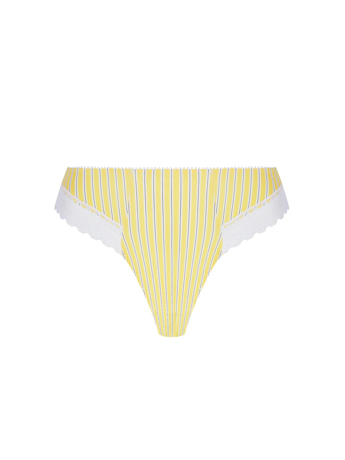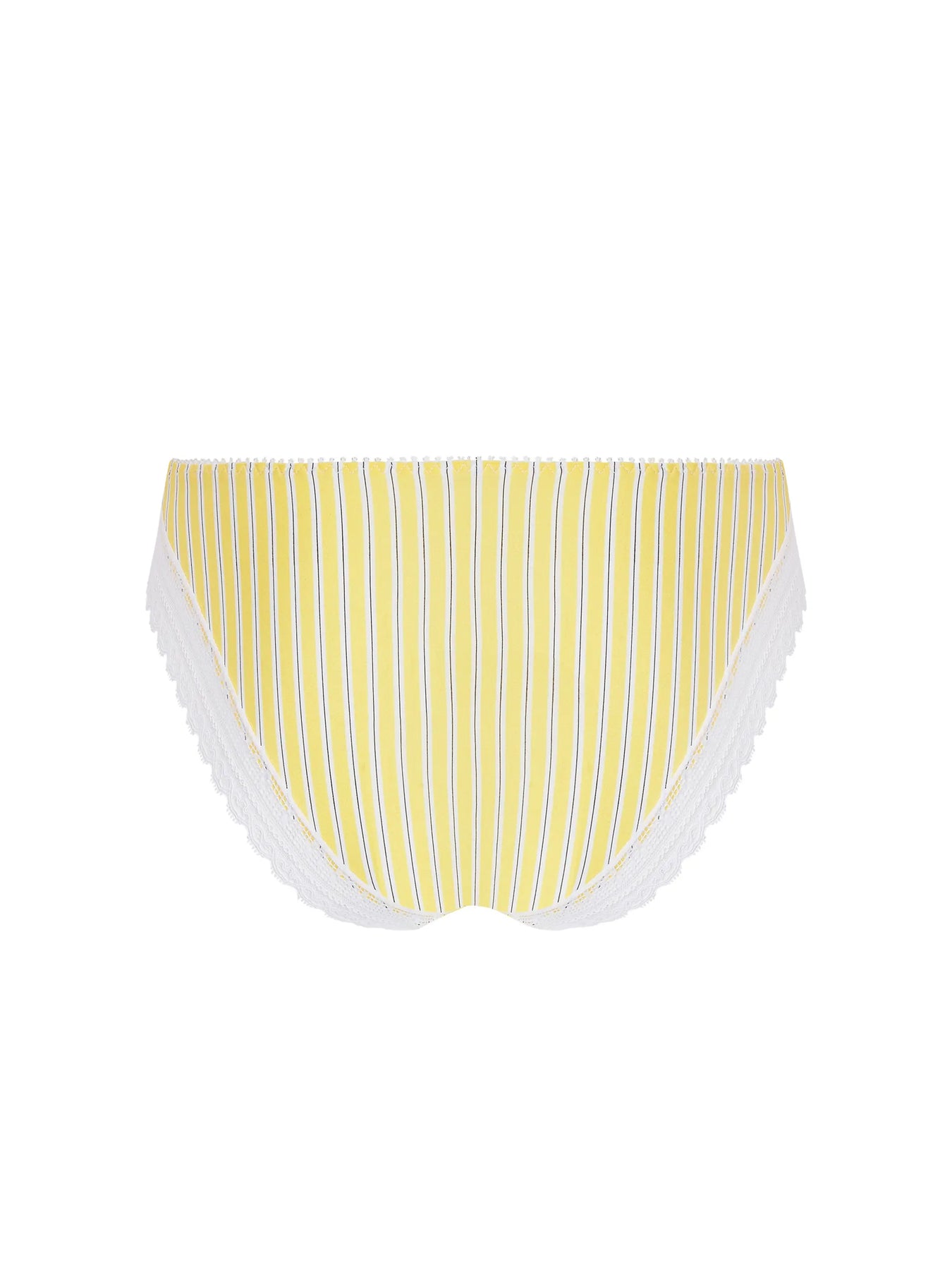 A vibrant yellow Italian brief in sheer mesh and satin piping invoking masculine tailoring in fine lingerie.