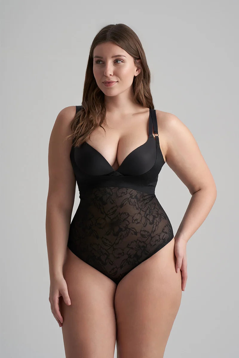 The ByeBra Lacy Open Bust Bodysuit in Black offers sophisticated lace design with discreet shaping and a flattering open bust silhouette.