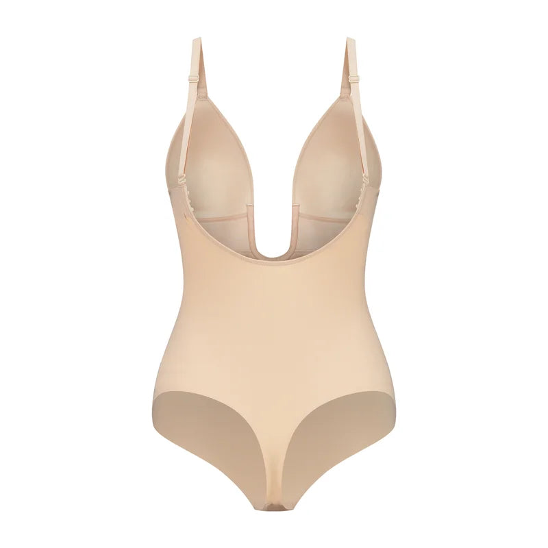 The ByeBra Sculpting Bodysuit Deep V Thong in Beige delivers strong shaping with a sleek, line-free finish.