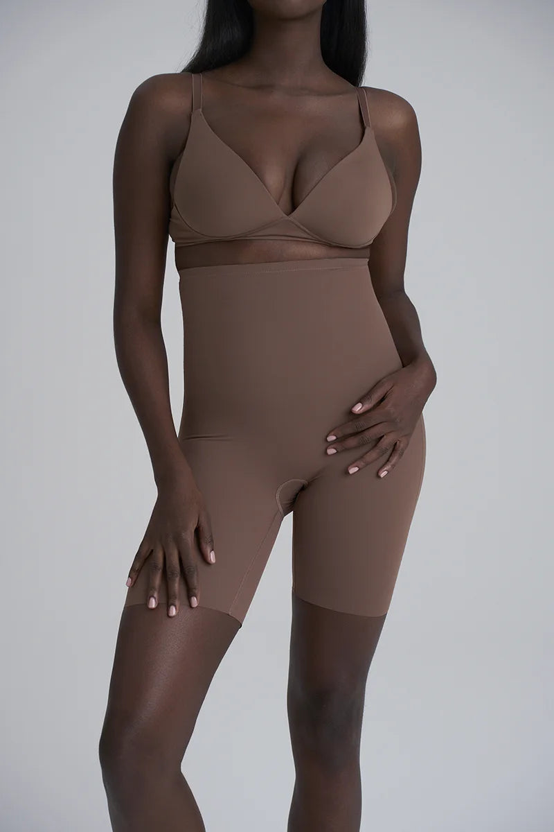 The ByeBra Sculpting High Waist Short in Cocoa delivers powerful shaping with seamless blending for deeper skin tones.