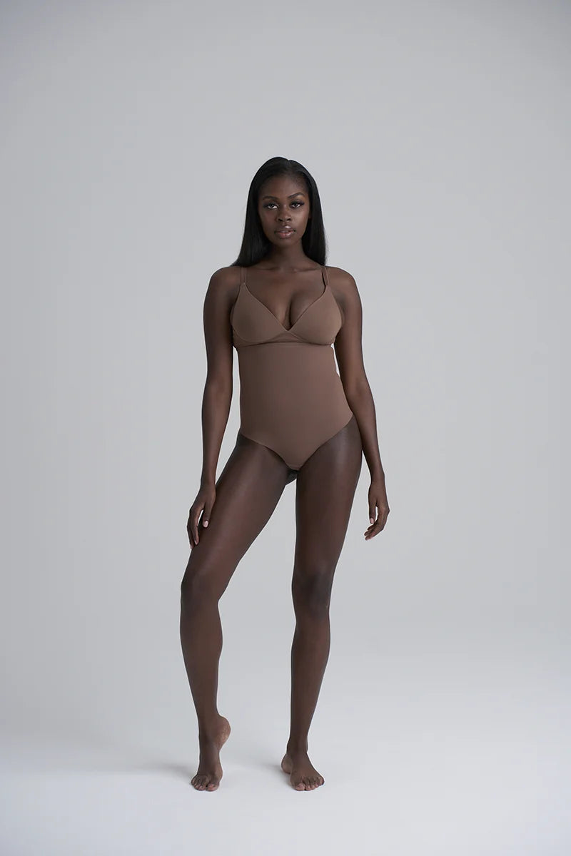 The ByeBra Sculpting High Waist Thong in Cocoa delivers powerful shaping with seamless blending for deeper skin tones.