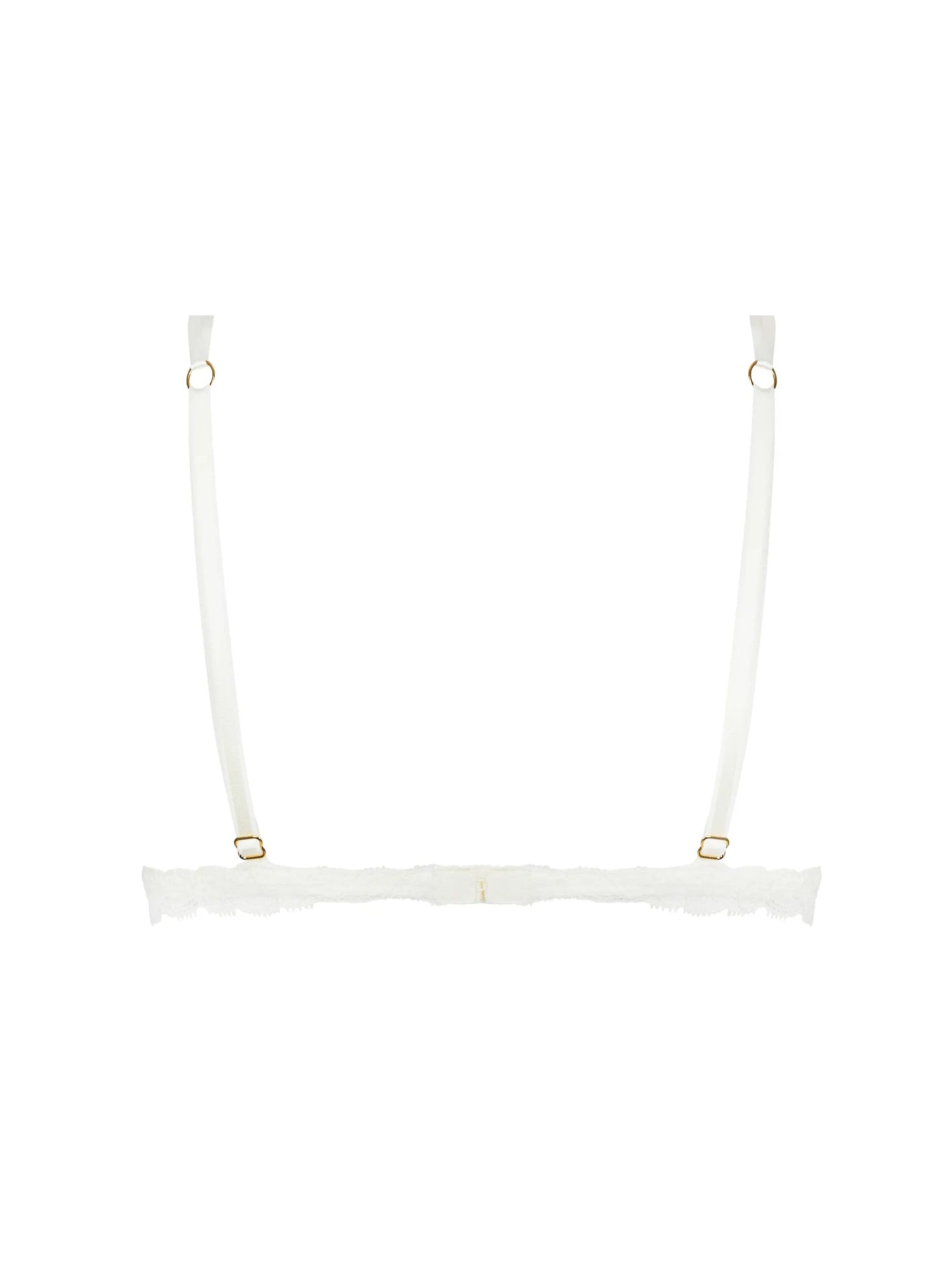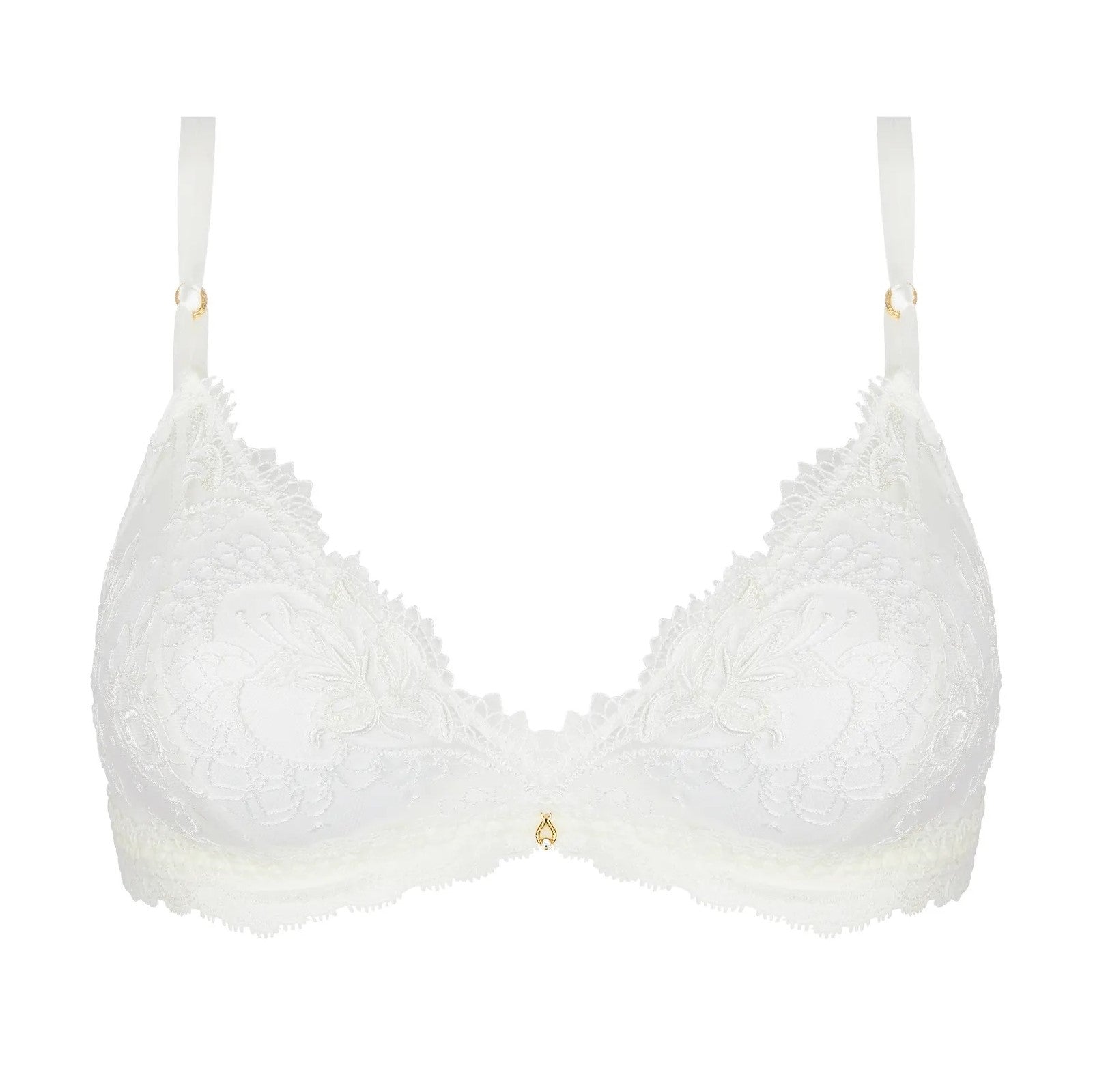 Gorgeous triangle bra featuring floral multithreaded embroidery and guipure cups and embroidered laize sides. Finished off with jeweled golden rhinestones.
