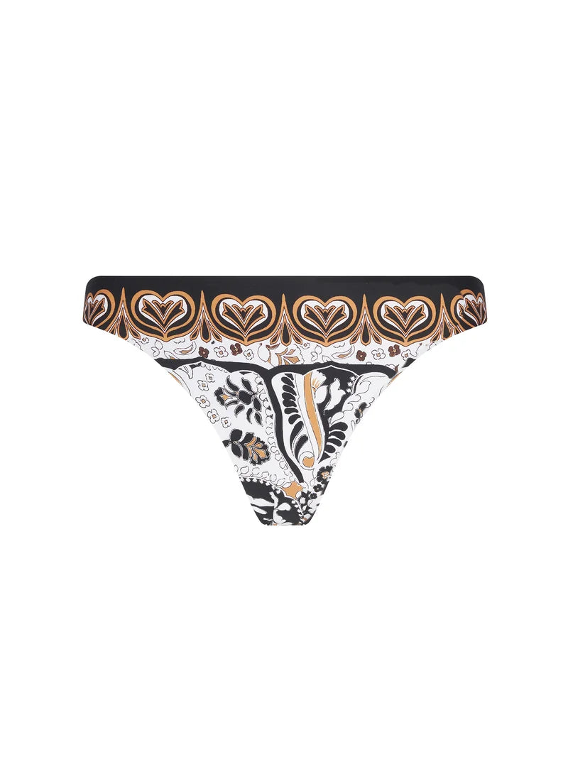 A bold Brazilian-cut bikini bottom designed to elongate the leg line with a modern, sensual silhouette.