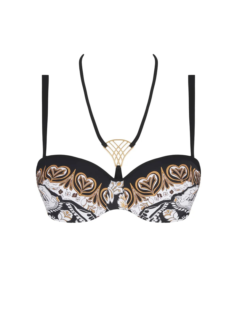 A chic cropped bustier bikini top blending high-fashion styling with refined swim support.