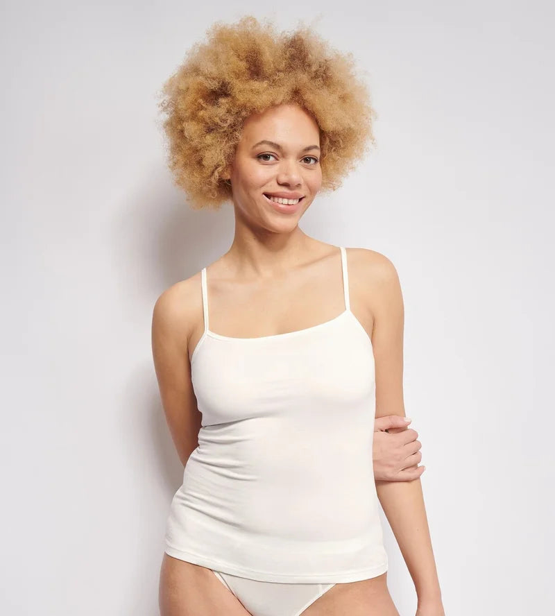 A Silk White spaghetti top offering silky microfibre softness with a light, breathable fit.