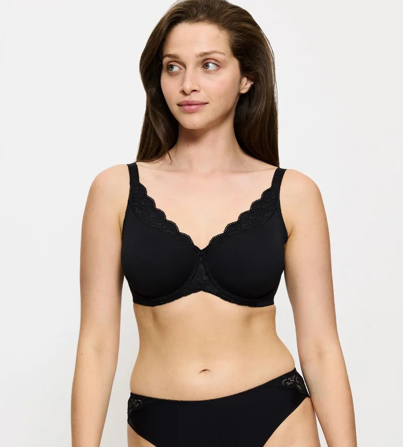 This bra redistributes the bust for a smoother profile, making it ideal under tailored clothing. Perfect for everyday support with elegant lace styling.