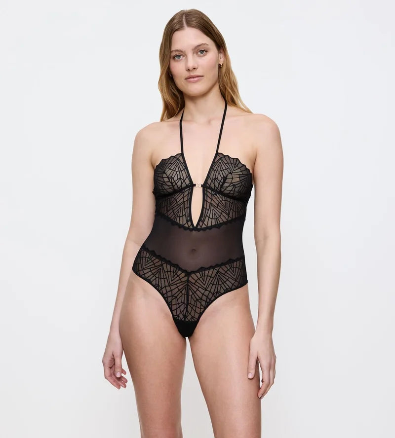 This lace bodysuit combines bold design with supportive structure. Underwired cups enhance shape, while sheer panels create a dramatic silhouette. Ideal as statement lingerie or styled under evening outfits.