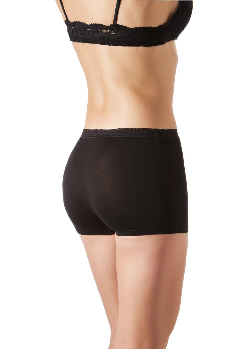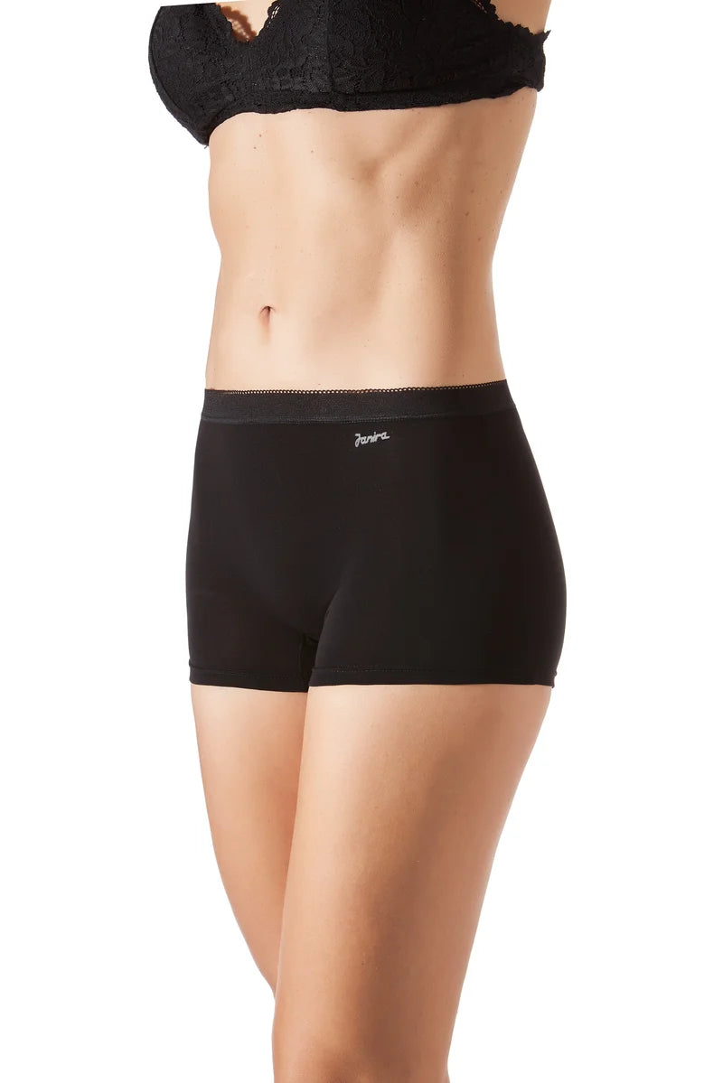 The Janira Esencial Boxer 2 Pack in Black offers everyday comfort with a modern, flattering silhouette. Crafted from a soft, breathable cotton blend, these boxer briefs feel gentle against the skin while allowing airflow to keep you comfortable throughout the day. The longer leg design provides extra coverage and prevents riding, making them ideal under dresses, skirts, and trousers. Gentle stretch ensures ease of movement without restriction, while the smooth finish remains discreet under clothing. Perfect for daily wear, work, or travel, this multipack is ideal for women who value comfort, coverage, and a sleek, supportive fit.
