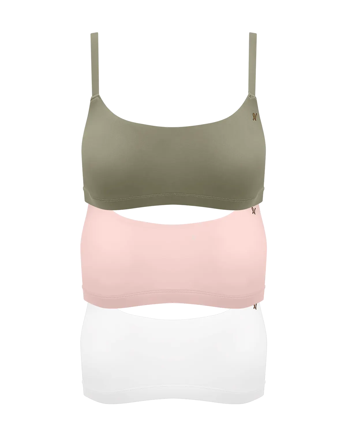 A three-pack of seamless scoop neck bralettes in Pink, White and Sage, offering second skin comfort with natural shaping.