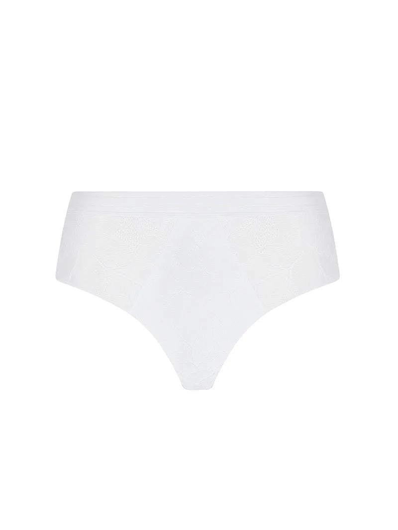 A lace-detailed boyshort combining coverage with floral cut-out artistry in pure white.