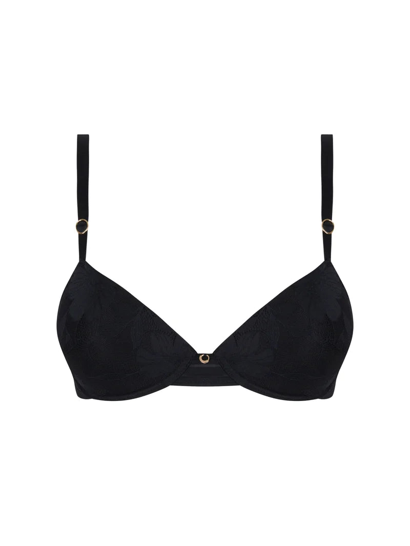 A smooth contour bra in Noir with Dentelle Rebelle lace accents for a lifted, rounded silhouette under clothing.