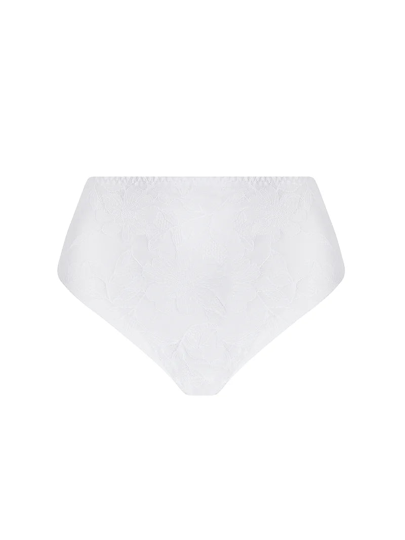 A high-rise brief in elegant lace for smoothing fit and refined style in classic white.