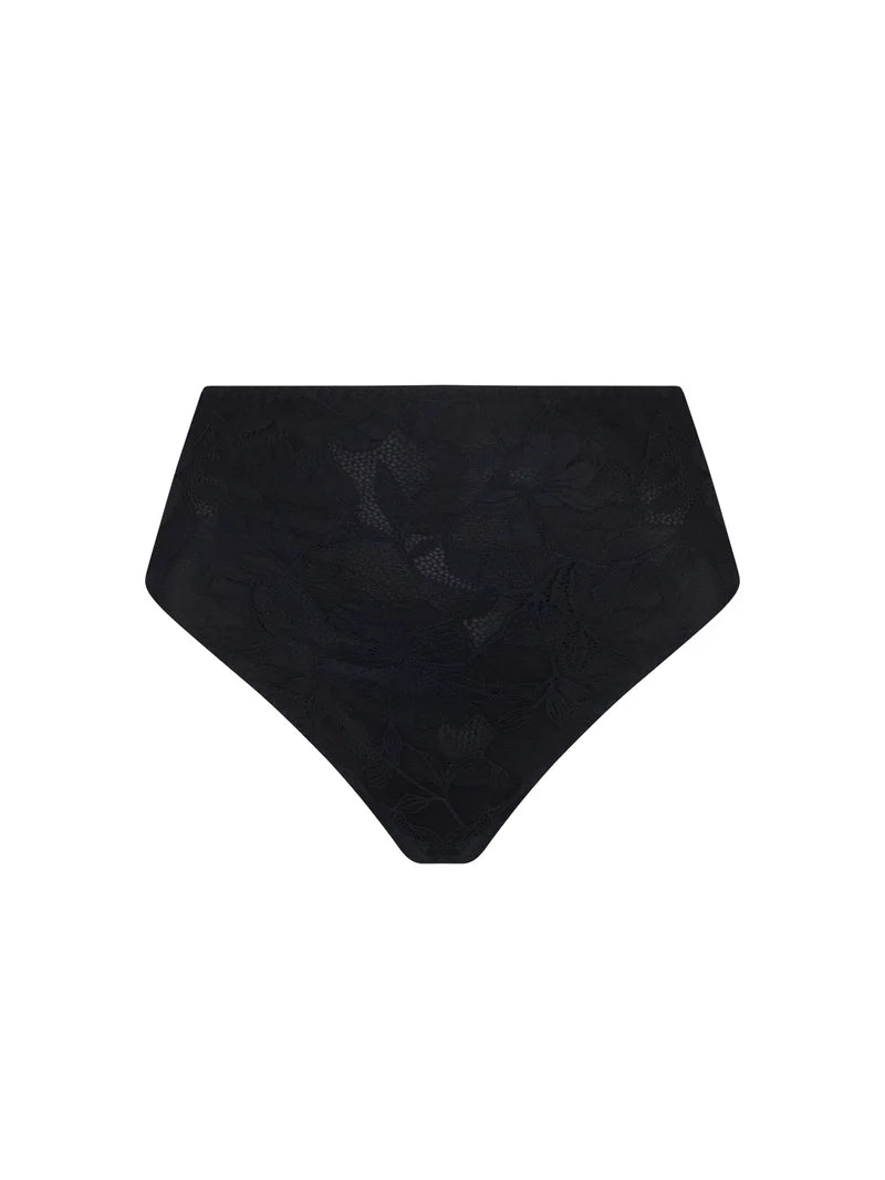 A flattering high-waist brief in Noir with lace-panelling and light smoothing.