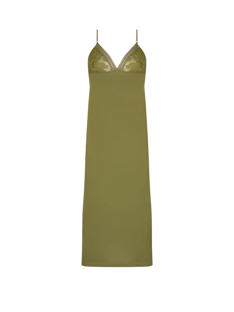 A flowing, lace-trimmed nightdress that blends sensuality with breezy comfort in moss-green tones.