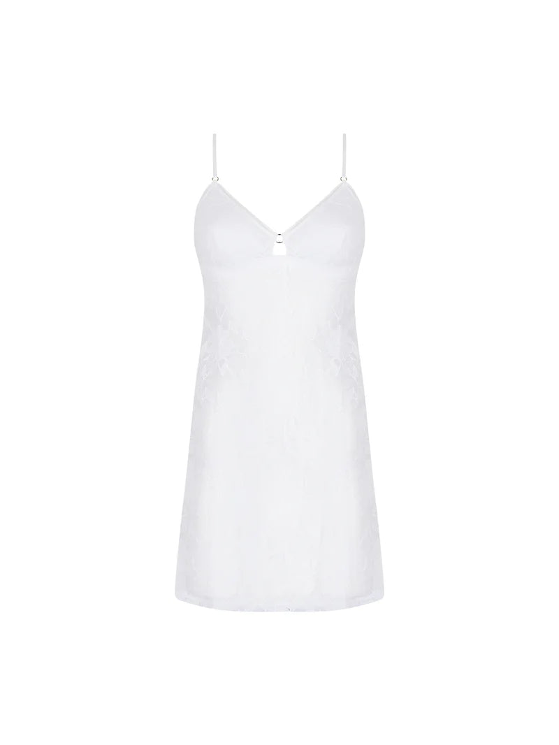 A silhouette-enhancing chemise with plunging lace neckline, perfect for romantic elegance in white.