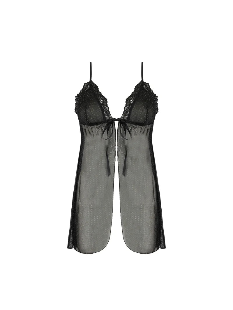 An ethereal babydoll in shimmer lace and airy mesh that drapes effortlessly.