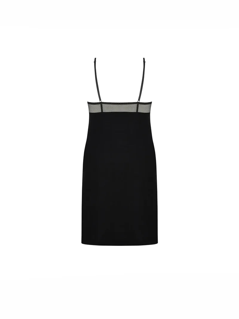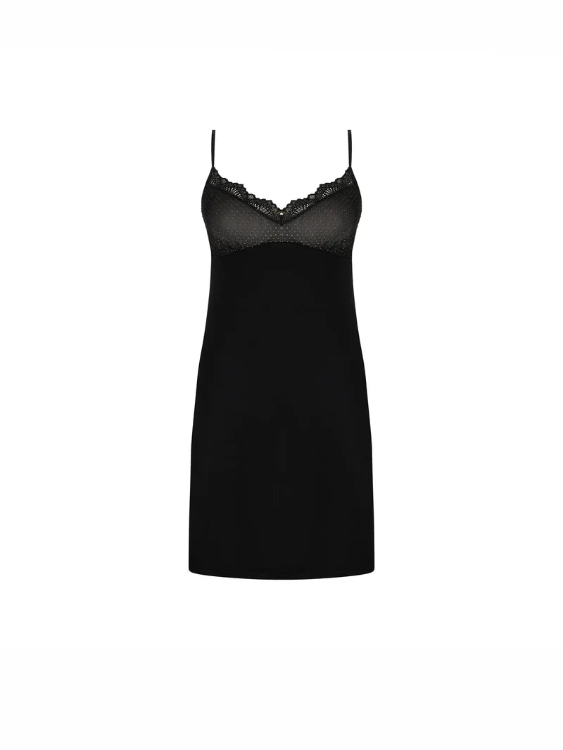 This mini length brings youthful energy to the line, with fluid mesh skimming the silhouette and sparkling lace framing the neckline. Ideal for special nights and elegant lounging when comfort and glamour should meet.