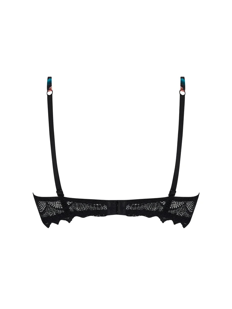 Fabric: Printed overlay on smooth moulded cups; lace detail