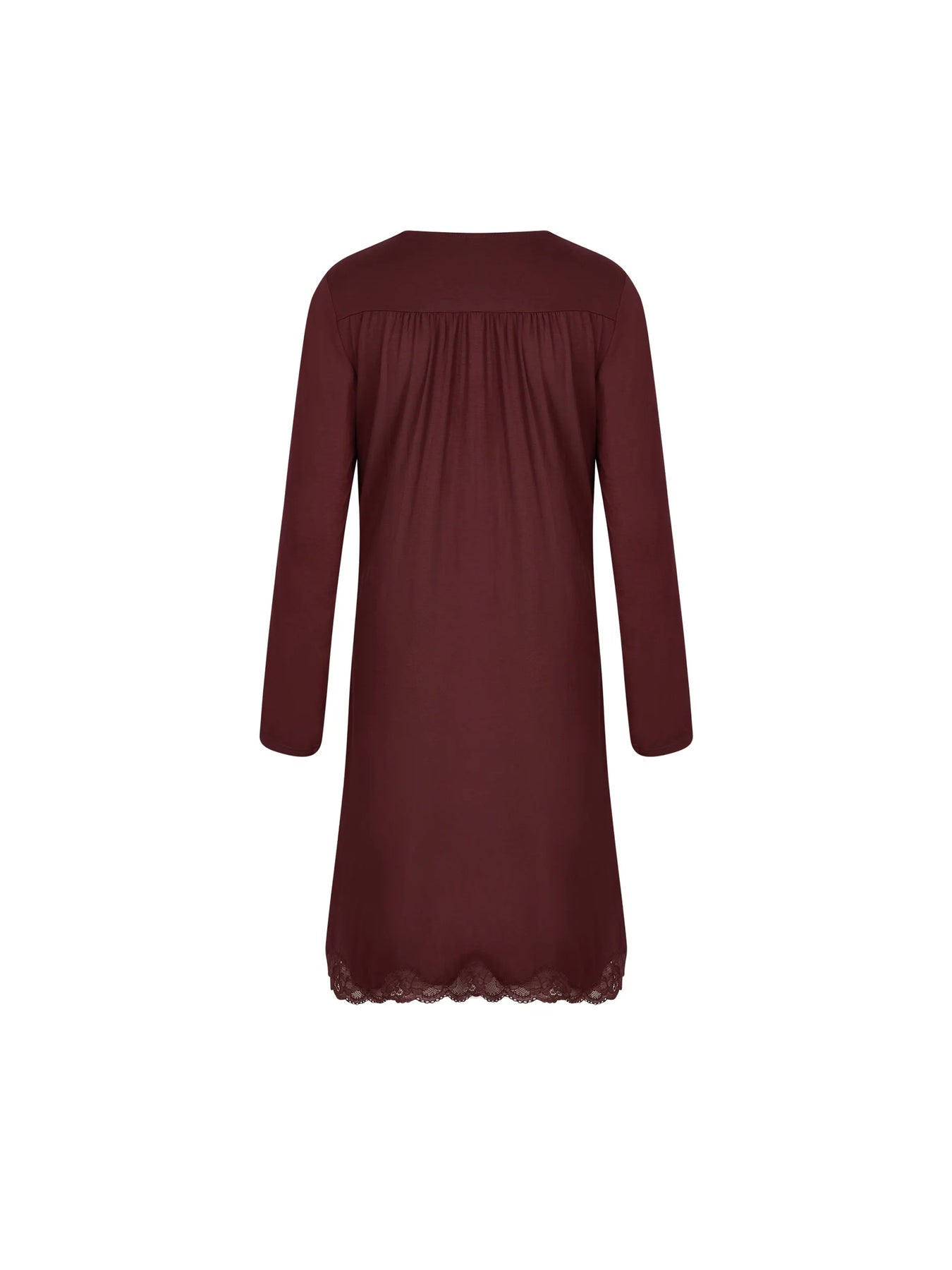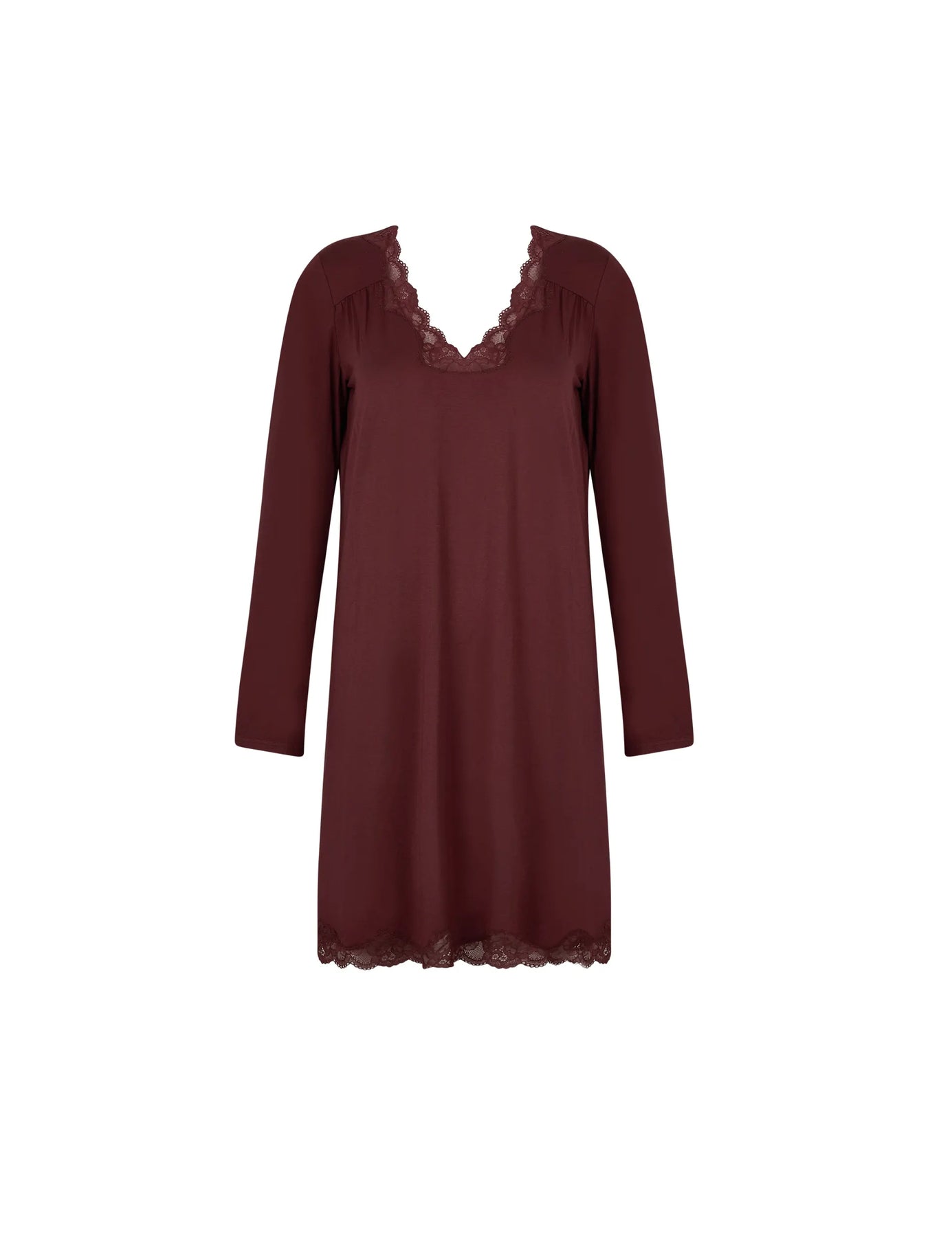 A warm cappuccino modal nightdress with delicate lace trimming and a graceful long line.