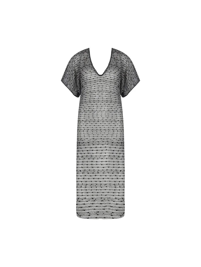 A sheer mesh caftan with dramatic drape.
