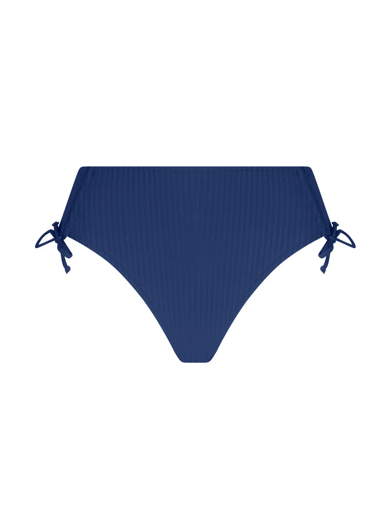A chic high-waist bikini brief blending graphic nautical stripes with flattering, adjustable comfort.