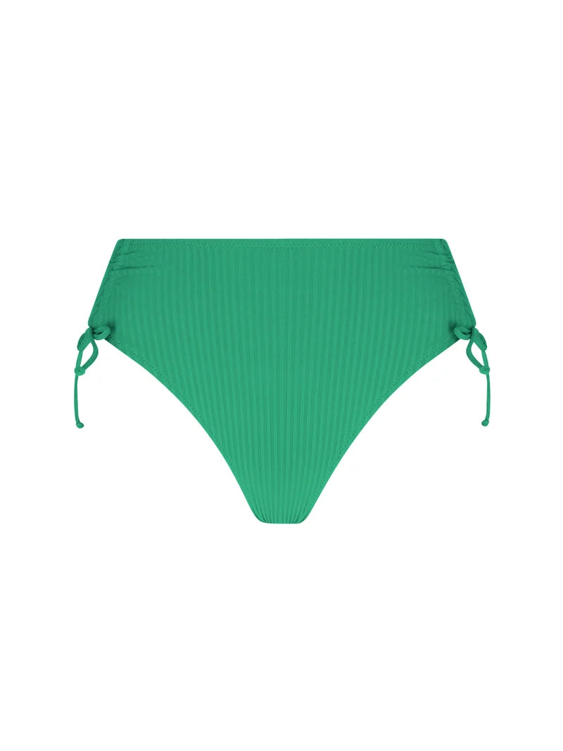 A sculpting high-waist bikini brief with adjustable sides and bold nautical stripes.