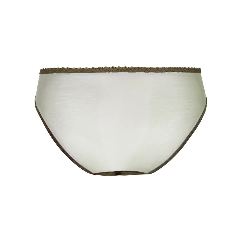 A timeless brief in luminous bronze lace and soft tulle that blends elegance with everyday comfort.