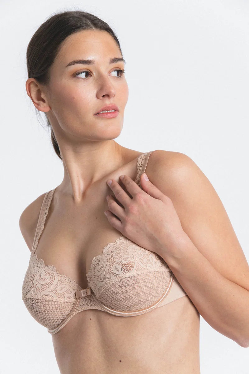 Romantic lace and supportive structure combine in this soft Smoky Pink underwired bra.