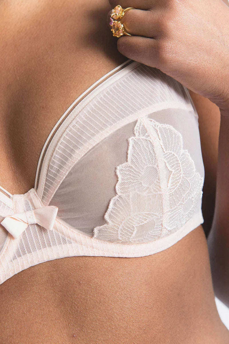 A balconette bra in Quartz offering uplift and shape with delicate lace artistry.