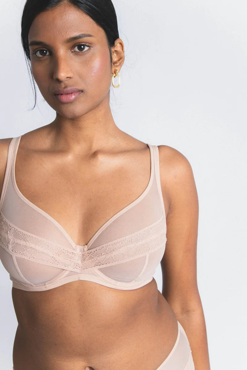 A plus-fit seamless tulle bra in Manhattan, offering enhanced support with a modern neutral tone.