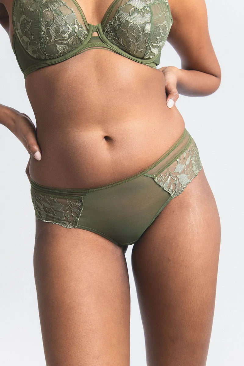 A lace boxer short in Leaf, giving fuller hip coverage with an elegant, modern aesthetic.