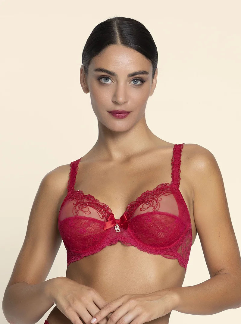 The Lise Charmel Soir De Venise Full Cup Bra in Rouge Venise radiates passion with supportive elegance.