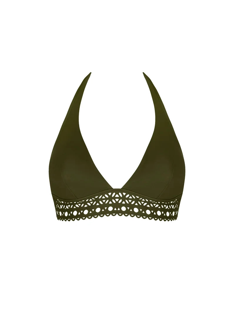 This unpadded triangle bikini top in Avocat offers a natural silhouette with minimal structure. Designed for comfort and ease, it highlights the couture fabric while allowing effortless movement and sun exposure.