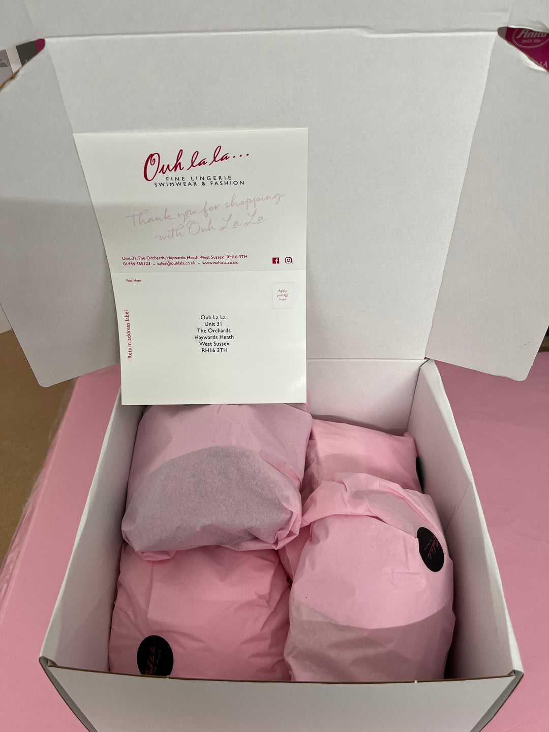 Ouh La La's packaging is fully recyclable & lovingly wrapped, minimizing environmental impact while delivering luxury lingerie to your doorstep.