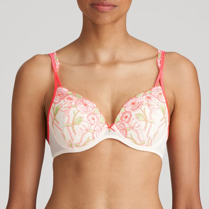 A romantic heart-shaped bra with smooth padded cups and exquisite floral embroidery in vibrant Fruit Punch.